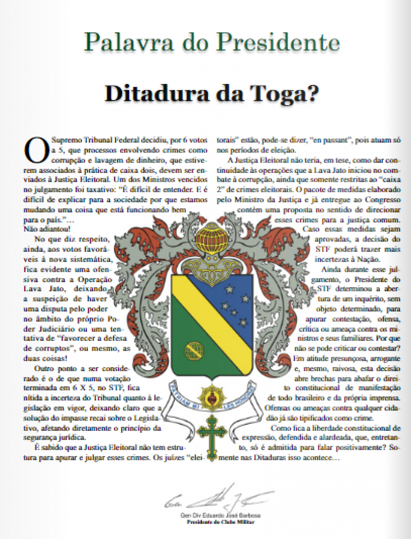 Assinado pelo General Eduardo José Barbosa, presidente do Clube Militar, um artigo sob o título “Ditadura da toga?” questiona o ministro Dias Toffoli por ter determinado a abertura de inquérito para investigar ameaças ao Supremo e aos familiares dos ministros.
