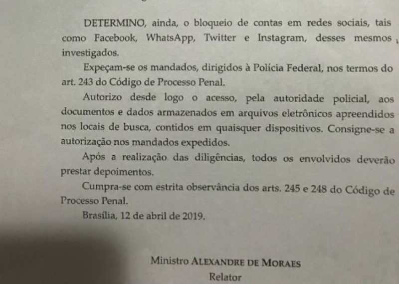 No mandado de busca, o ministro Alexandre de Moraes ordena à Polícia Federal apreender computadores, tablets, celulares e outros dispositivos eletrônicos encontrados nas casas dos suspeitos. O magistrado também determina que a PF tenha acesso a “documentos e dados armazenados em arquivos eletrônicos” e que colha os depoimentos de todos os alvos da operação.