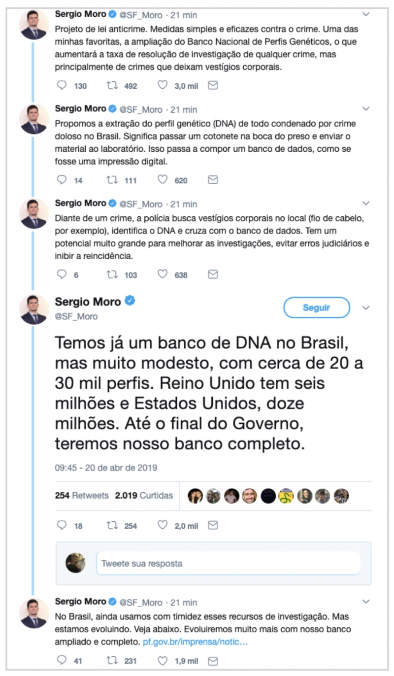 O ministro da Justiça e Segurança Pública, Sergio Moro, afirmou neste sábado (20.abr.2019), em seu perfil no Twitter, que o Brasil terá 1 “banco completo” de DNA até o fim do governo do presidente Jair Bolsonaro.
