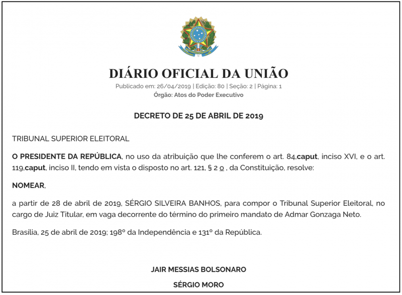O presidente da República, Jair Bolsonaro, nomeou Sérgio Silveira Banhos, para ser ministro titular do TSE (Tribunal Superior Eleitoral). Ele atuará na corte nas eleições municipais de 2020. A vaga ficou aberta após o término do mandato do ministro Admar Gonzaga Neto.