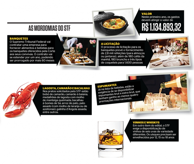 O processo de contratação do buffet prevê o fornecimento de pelo menos 2,8 mil refeições (almoços ou jantares), 180 cafés da manhã, outros 180 brunchs (cafés mais reforçados) e três tipos de coqueteis para 1.600 pessoas. Na lista de exigências do contrato, previsto para durar 12 meses, prorrogáveis por mais 60 meses, estão pratos dignos dos melhores restaurantes do mundo, comparados aos badalados cinco estrelas do guia Michelin. No menu do Supremo, a empresa está obrigada a disponibilizar pratos com medalhões de lagosta com molho de manteiga queimada, bobó de camarão, camarão à baiana, bacalhau à Gomes de Sá, arroz de pato, pato assado com molho de laranja, galinha d’Angola assada, vitela assada, codornas, carré de cordeiro, medalhões de filé, tournedos de filé com molho de mostarda, pimenta, castanha de caju com gengibre, entre outros.