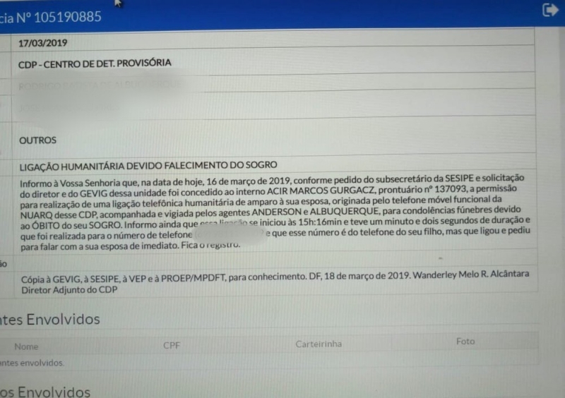 Segundo o relatório interno da penitenciária, por causa da morte do sogro de Gurgacz, em março, o subsecretário Adval Cardoso pediu ao diretor do presídio que deixasse o detento ligar para a família.