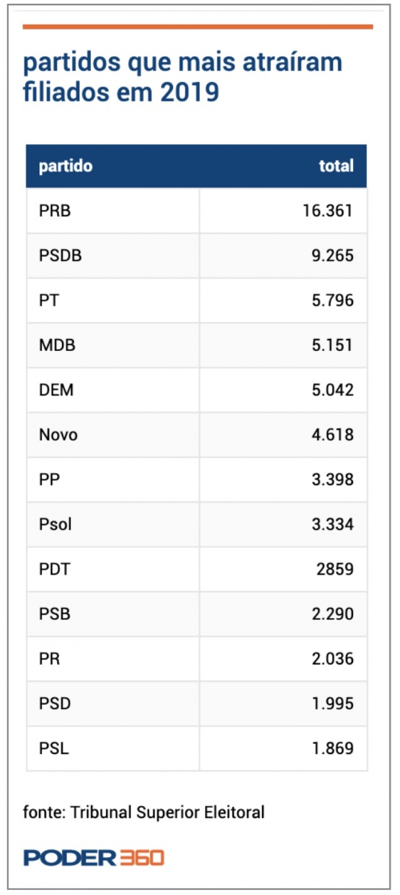 O PSL, partido do presidente Jair Bolsonaro, foi o que mais cresceu em 2018. Ele teve 1 boom de filiados após o 1º turno das eleições de 2018. Conquistou, apenas no mês de outubro do ano passado, cerca de 20 mil novos filiados –mais do que quase todos os partidos conseguiram durante o ano. Em 2019, porém, ficou apenas em 13º lugar entre os que atraíram mais filiados. No ano, conquistou 1.869 novos membros.