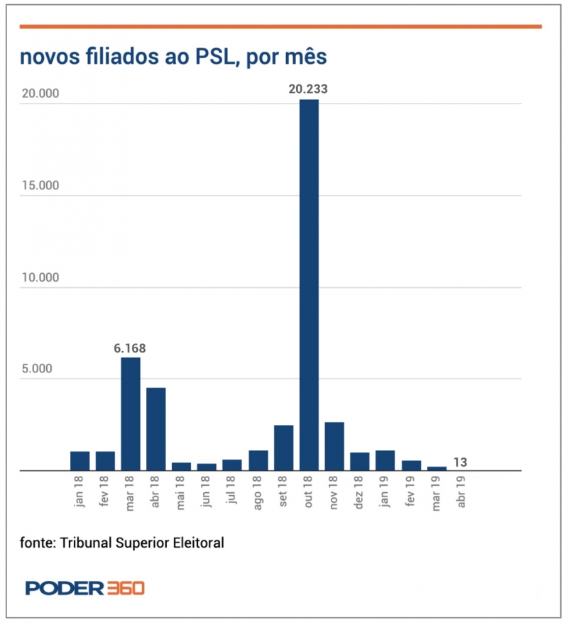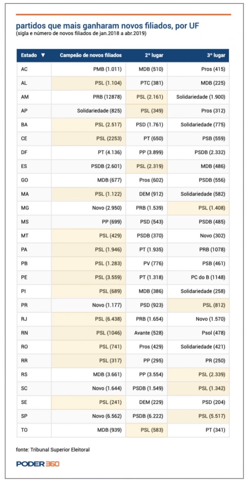 Considerando o período de janeiro de 2018 a abril de 2019, o PSL aparece entre as 3 siglas que mais ganharam filiados em 23 das 27 unidades da Federação. Ou seja, foi 1 aumento orgânico, espalhado pelo Brasil. Só que acabou.