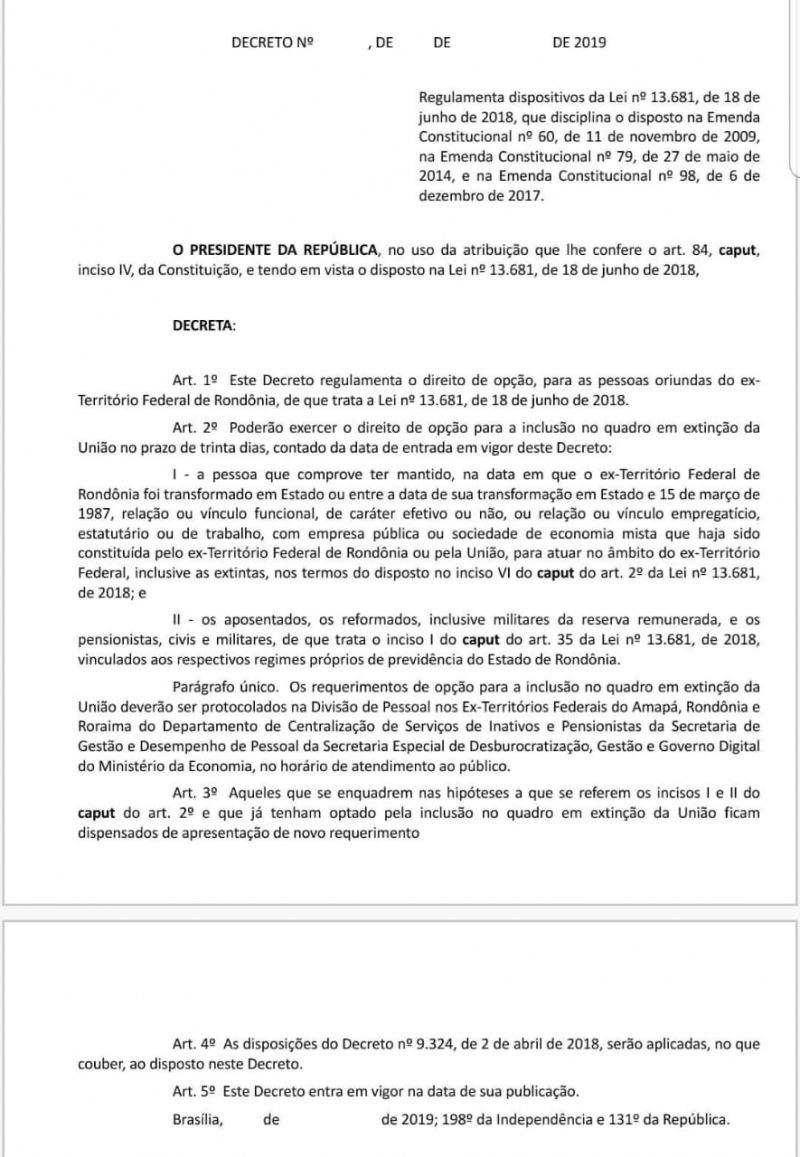 O decreto abre o prazo de 30 dias para que servidores contemplados pela lei 13.681/2018 peçam inclusão no quadro da União. Serão atendidos aqueles que comprovem ter mantido vinculo com empresas estatais do ex-território de Rondônia (art 2ª, inciso VI), aposentados, pensionistas, reformados e militares da reserva remunerada vinculados aos regimes próprios de previdência de Rondônia. Os pedidos serão analisados pela Comissão Especial de Ex-territórios.