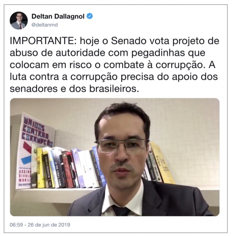 Nesta 4ª (26.jun), o coordenador da força-tarefa da Lava Jato, Deltan Dallagnol criticou no Twitter o projeto e disse que o texto, se aprovado, pode representar“grande retrocesso” no combate à corrupção por conter “pegadinhas”.