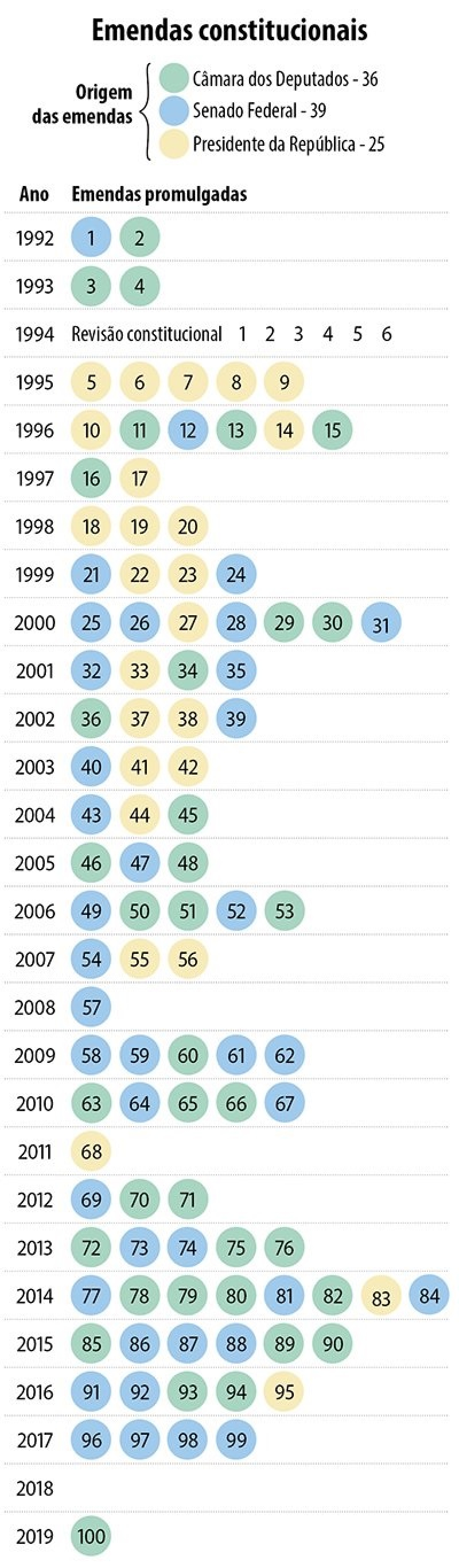 Desde então, o único ano sem a promulgação de nenhuma nova emenda constitucional foi 2018. Isso aconteceu porque esteve em curso, de fevereiro a dezembro, uma intervenção federal no estado do Rio de Janeiro. A Constituição não pode ser emendada durante a vigência de intervenções federais.