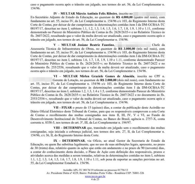 Além deles, também foram sancionadas as seguintes pessoas: Márcio Antônio Félix Ribeiro, ex-secretário adjunto de Educação; Josiane Beatriz Faustino, então chefe da Assessoria Técnica de Infraestrutura de Obras; e Mirlen Graziele Gomes de Almeida, à época gerente de Lotação.