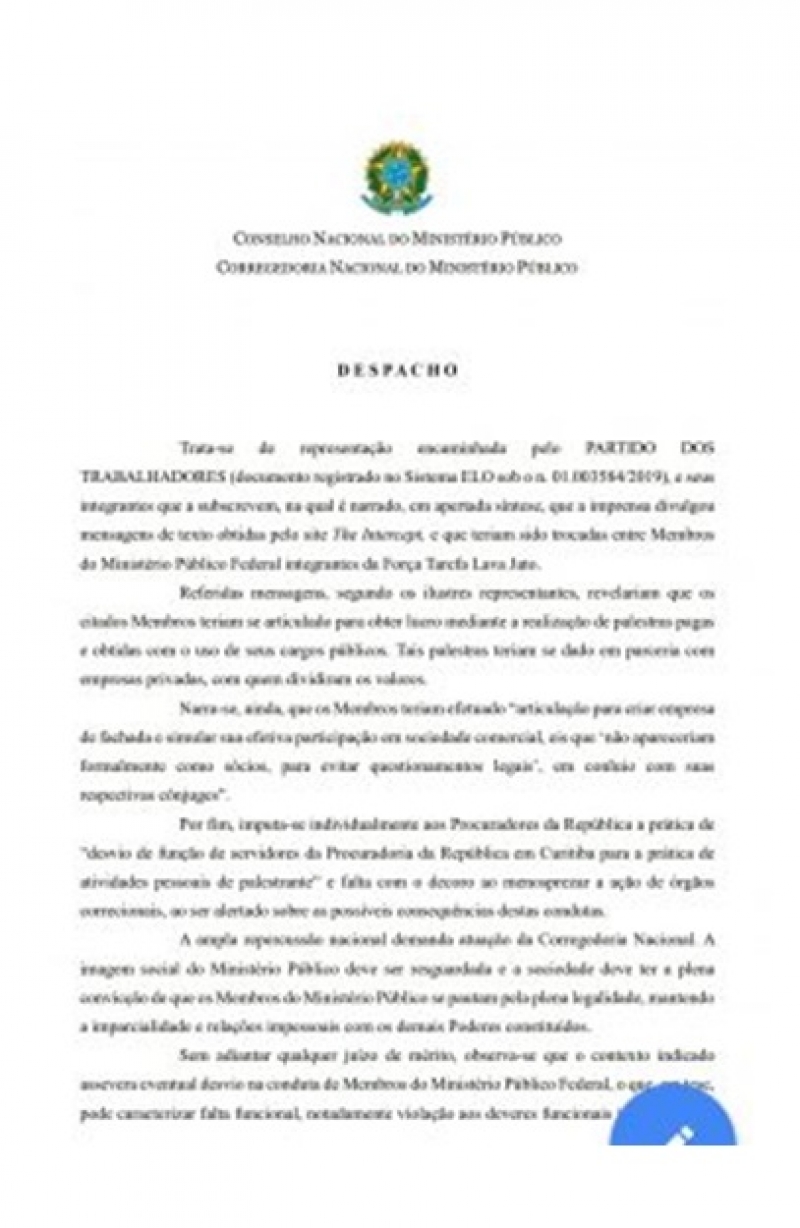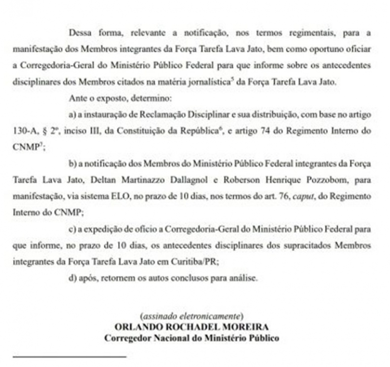 O corregedor nacional do Ministério Público, Orlando Rochadel, determinou a instauração de reclamação disciplinar contra Deltan Dallagnol, atendendo a pedido do PT com base nas matérias de Verdevaldo.