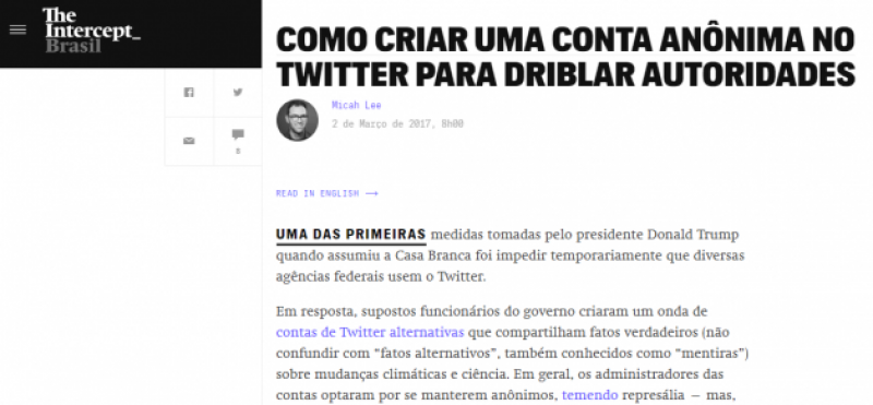 Ela é assinada pelo engenheiro de TI Micah Lee, da equipe do Intercept nos EUA, e tem o seguinte título: “Como criar uma conta anônima no Twitter para driblar autoridades.”