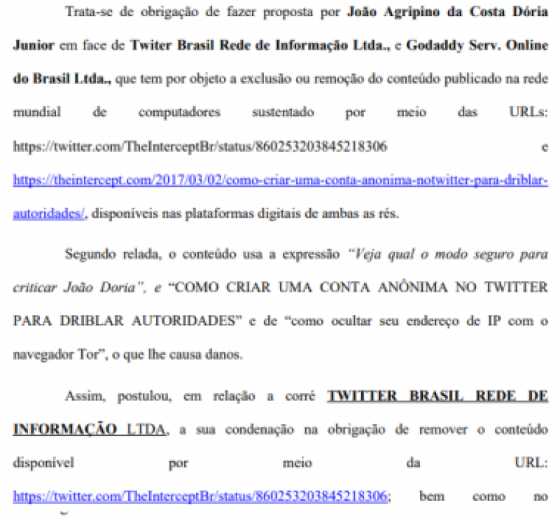 O juiz Fernando José Cúnico, de São Paulo, condenou Twitter e GoDaddy a excluírem de suas plataformas conteúdo publicado pelo site The Intercept.