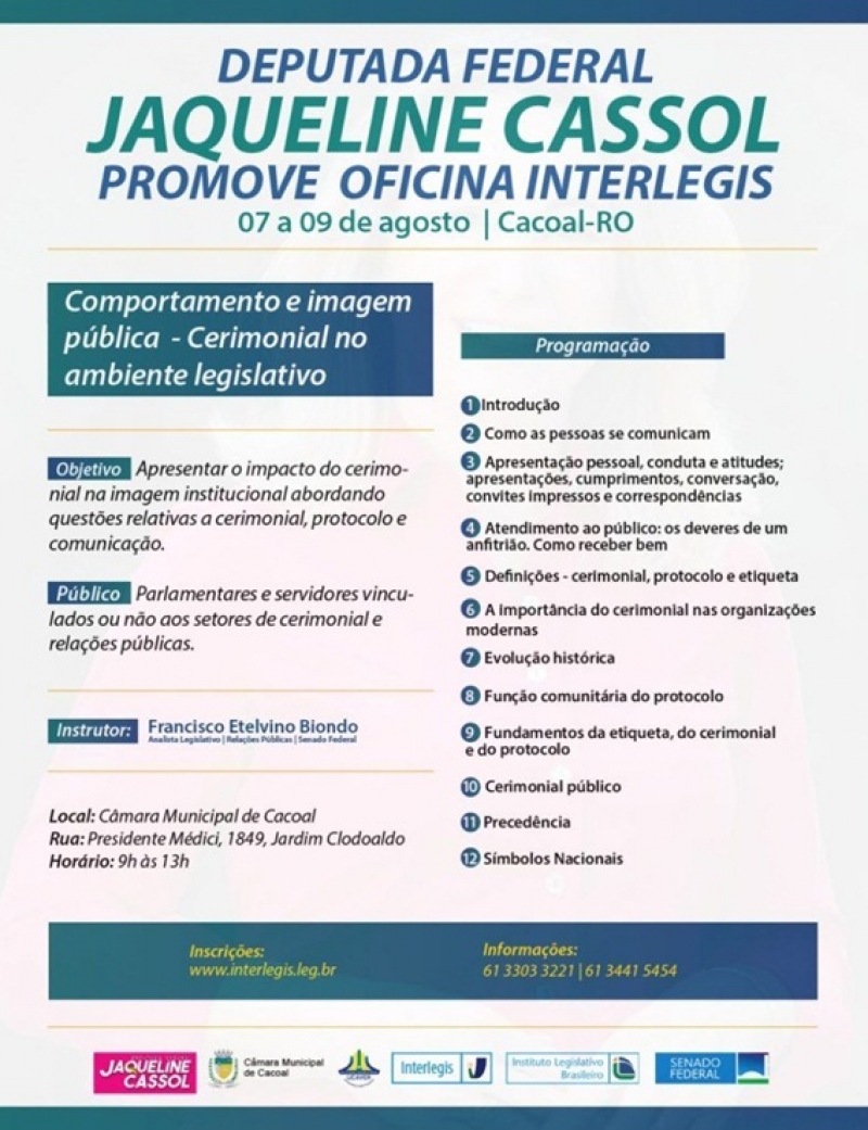A Oficina Interlegis, do Senado Federal, realizará oficina sobre Comportamento, Imagem Pública e Cerimonial no Ambiente Legislativo nos dias 07, 08 e 09 de agosto, em Cacoal, contou com o apoio da deputada Jaqueline Cassol
