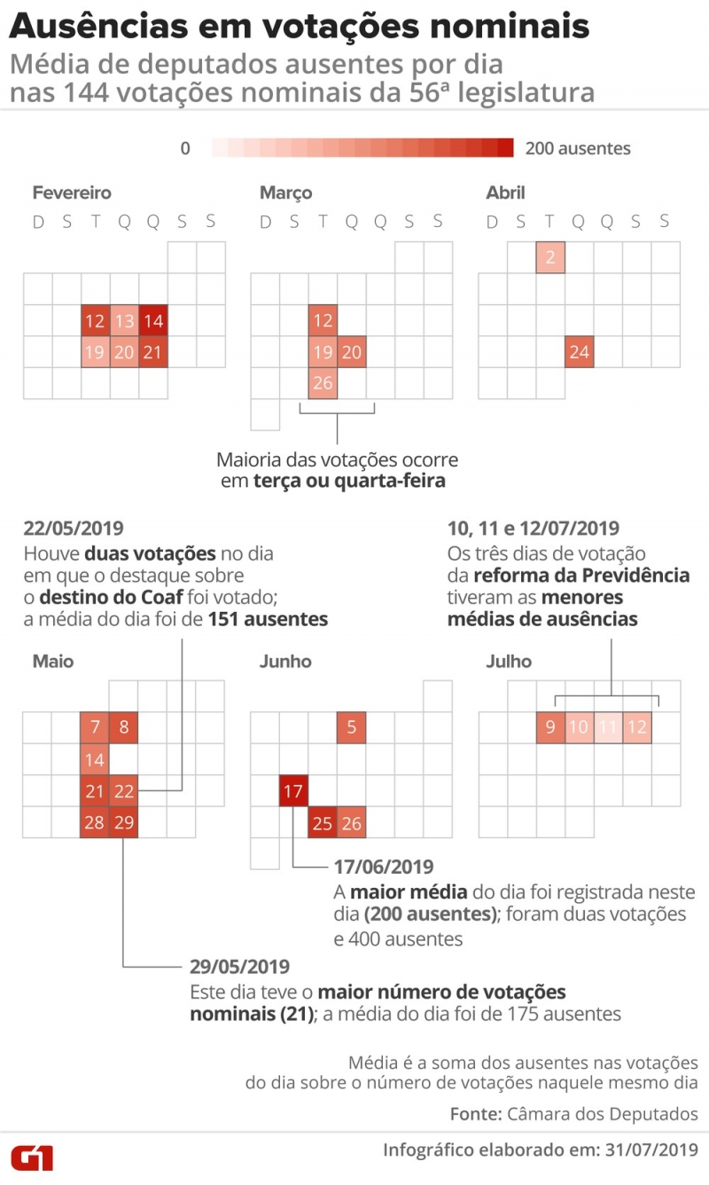 Na segunda-feira, um levantamento do G1 mostrou que 230 deputados faltaram a pelo menos 1/4 das votações nominais da Câmara no primeiro semestre legislativo. Isso significa, portanto, que 44% do total de parlamentares estiveram ausentes em ao menos 25% das votações nominais na Câmara dos Deputados durante a atual legislatura.