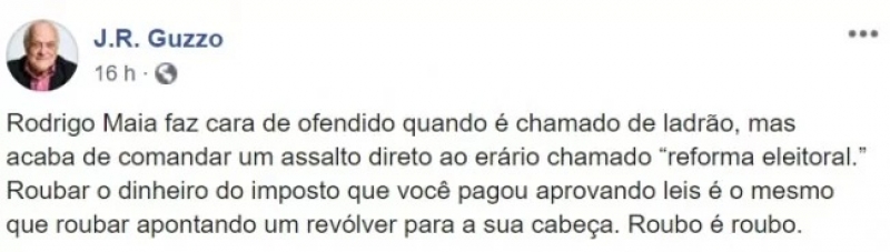 “Rodrigo Maia faz cara de ofendido quando é chamado de ladrão, mas acaba de comandar um assalto direto ao erário chamado ‘reforma eleitoral’. Roubar o dinheiro do imposto que você pagou aprovando leis é o mesmo que roubar apontando um revólver para a sua cabeça. Roubo é roubo.”