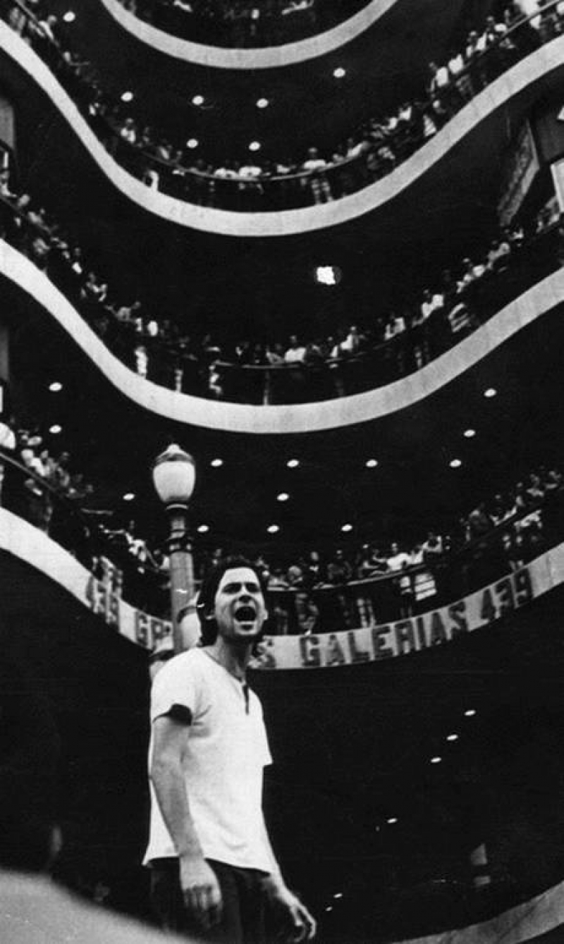 O então líder estudantil José Dirceu, apelidado de Ronnie Von das Massas, na Galeria do Rock em São Paulo