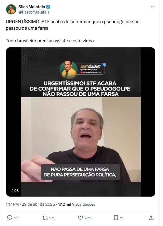 – URGENTÍSSIMO! STF acaba de confirmar que o pseudogolpe não passou de uma farsa. Todo brasileiro precisa assistir a este vídeo – escreveu o pastor nas redes sociais.