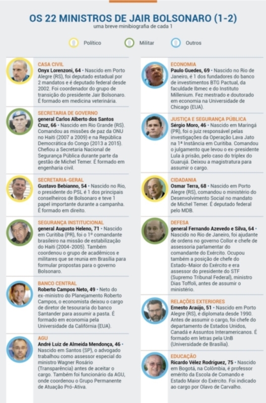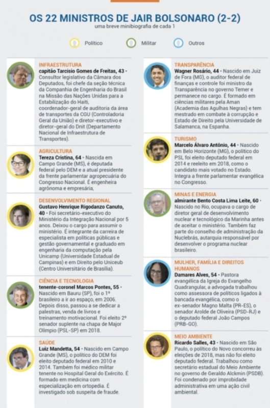 Bolsonaro já empossou 21 dos 22 ministros. O indicado para presidir o Banco Central, que tem status de ministério, Roberto Campos Neto, ainda precisa ser sabatinado e ter sua nomeação aprovada pelo Senado.