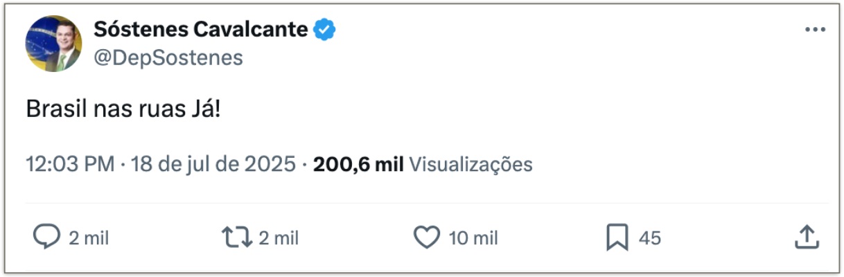 O líder do PL na Câmara dos Deputados, Sóstenes Cavalcante (PL-RJ), publicou em sua conta no X uma convocação para que os apoiadores de Bolsonaro vão às ruas.
