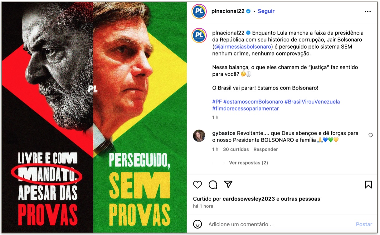 No Instagram, o PL (Partido Liberal) nacional também se manifestou a respeito da operação contra o ex-presidente.