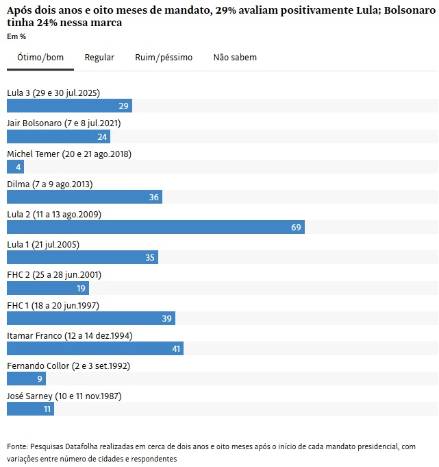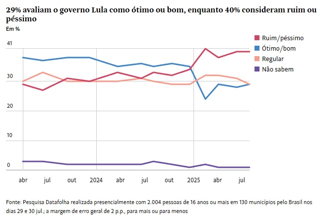A expectativa do entorno do presidente Lula (PT) acerca de ganhos de imagem imediatos no embate com o americano Donald Trump não se concretizou. Segundo o Datafolha, o petista segue com avaliação estável, tendo seu governo reprovado por 40% e aprovado por 29%.