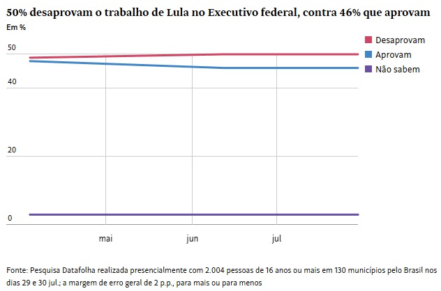 Quando questionados acerca do trabalho de Lula como presidente, há estabilidade estática de números ante o resultado de junho: 50% o reprovam e 46% o aprovam.