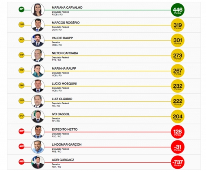 Dividindo a ala dos piores com Gurgacz, estão os deputados federais Expedito Netto (PSD), em 351º lugar, e Lindomar Garçon (PRB), lá atrás, na 455º posição.