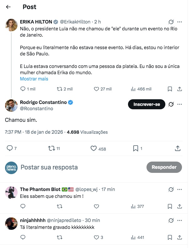 – Não, o presidente Lula não me chamou de “ele” durante um evento no Rio de Janeiro. Porque eu literalmente não estava nesse evento. Há dias, estou no interior de São Paulo. E Lula estava conversando com uma pessoa da plateia. Eu não sou a única mulher chamada Erika do mundo. Mas a fixação dos bolsonaristas com a minha figura, e o medo que meu crescimento causa, os leva a um comportamento quase animalesco ao ouvirem o que pensam ser alguém se referindo a mim – escreveu Hilton.