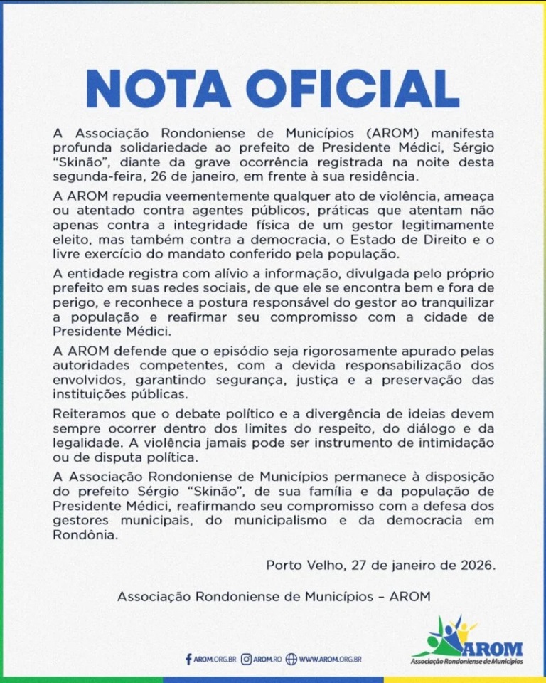 Através de Nota Oficial, a AROM manifestou solidariedade ao prefeito Sérgio Skinão, aos seus familiares e à população de Presidente Médici, reafirmando seu compromisso com a defesa dos gestores municipais, da democracia e do exercício legítimo do mandato público em Rondônia