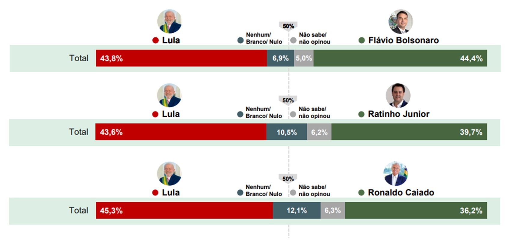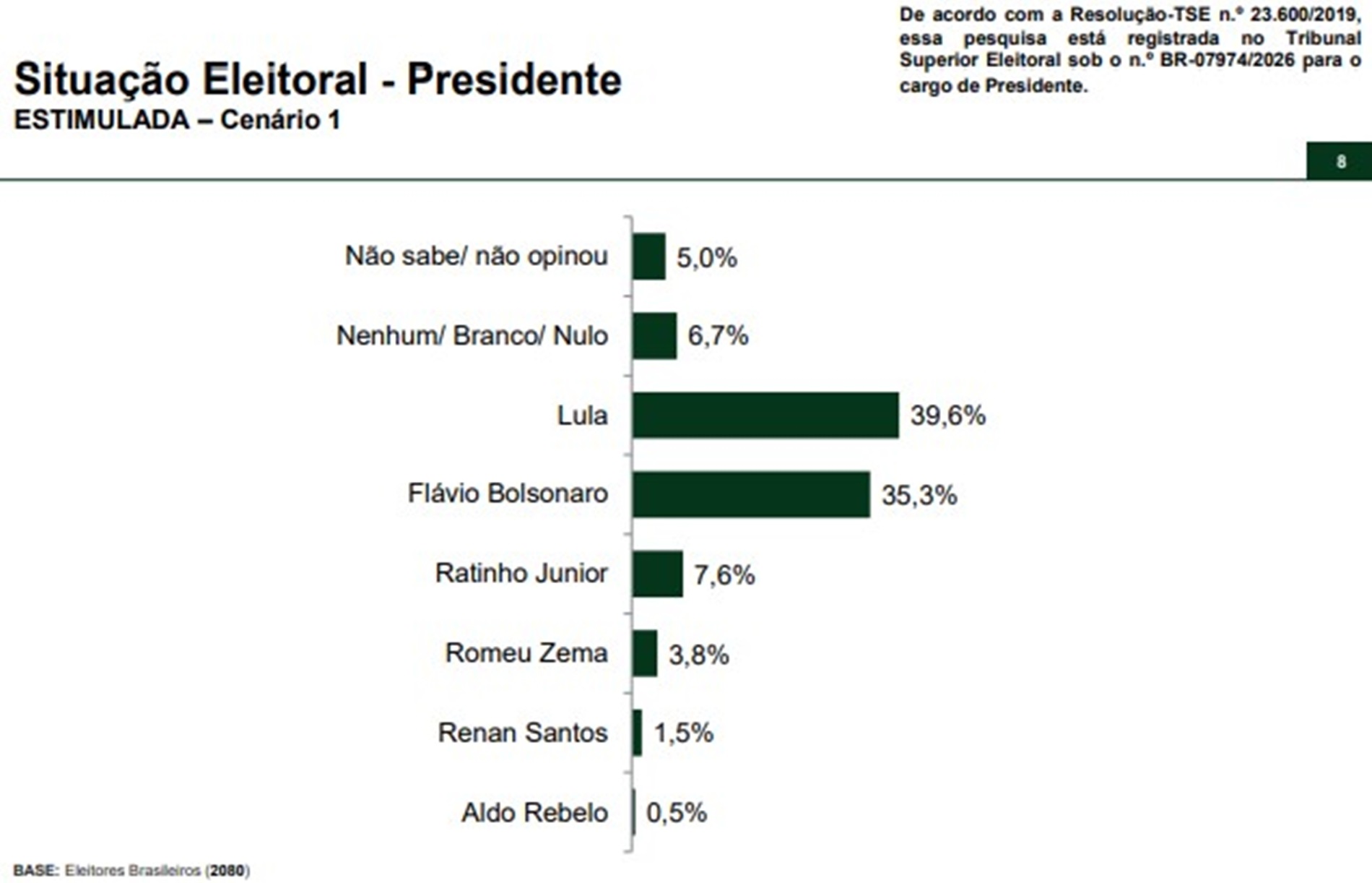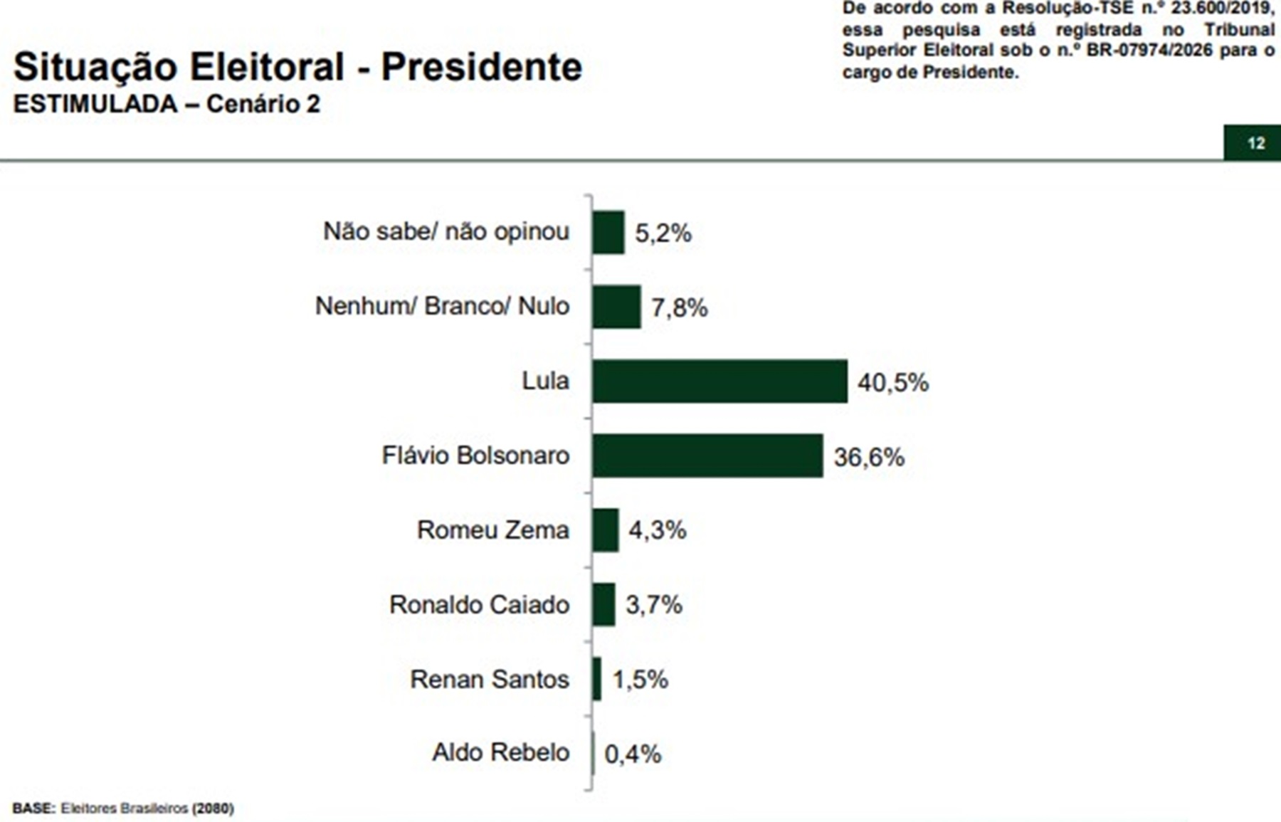 No primeiro cenário, em uma eventual disputa entre Lula, Flávio Bolsonaro, Ratinho Júnior (governador do Paraná), Romeu Zema (governador de Minas Gerais), Renan Santos e Aldo Rebelo, o petista tem 39,6% das intenções de voto, enquanto Flávio aparece com 35,3%.