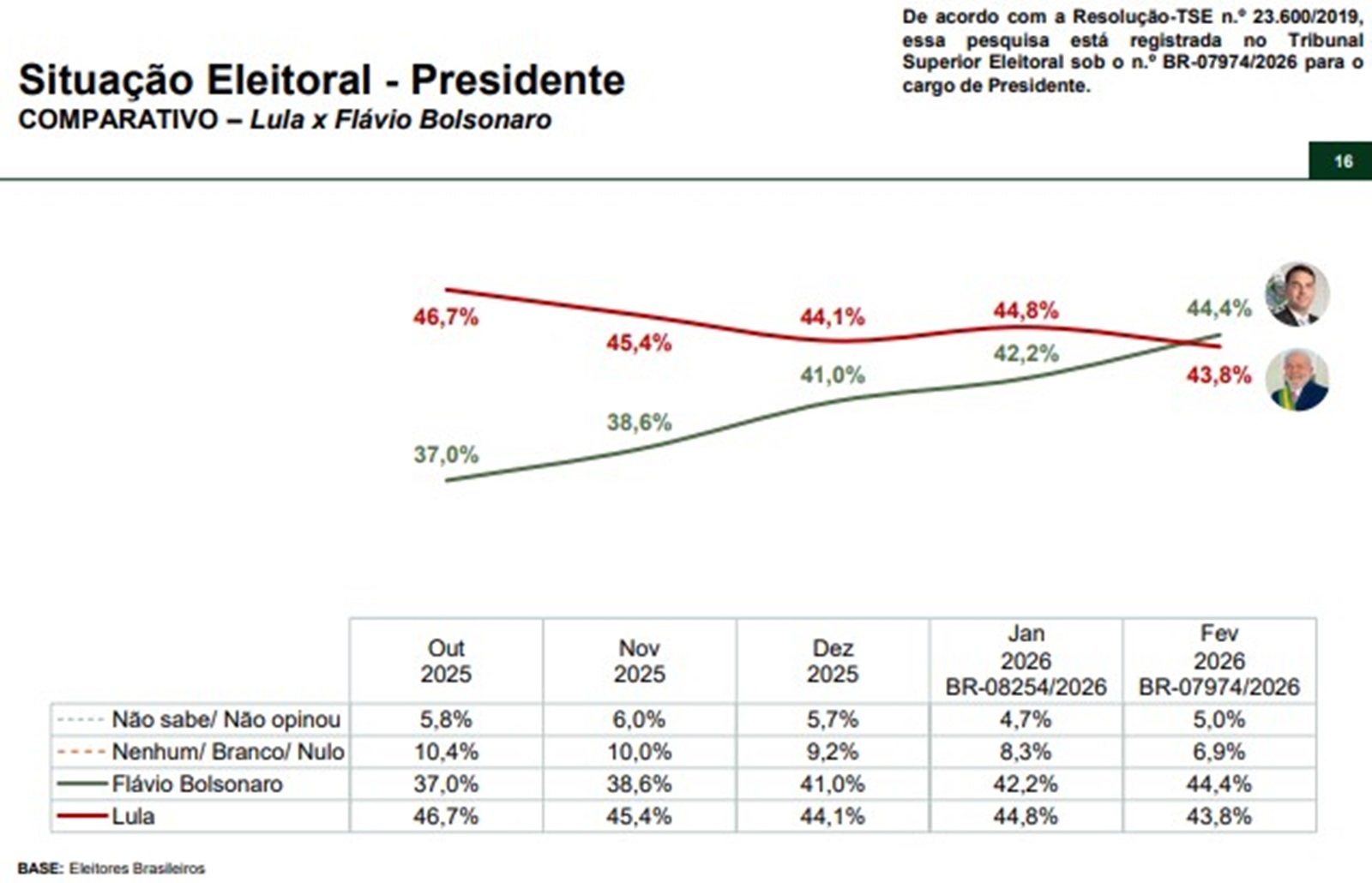 No comparativo entre os dois pré-candidatos, Lula apresentou queda de um ponto percentual nas intenções de voto, no comparativo com levantamento divulgado pelo mesmo instituto em janeiro de 2026. O petista caiu de 44,8% para 43,8%.
