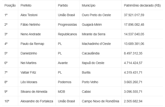 O estado de Rondônia, que possui 52 municípios, têm prefeitos com patrimônios que variam de poucos milhares a vários milhões de reais. Entre os gestores com maior volume de bens declarados estão empresários, produtores rurais e políticos que construíram patrimônio antes de chegar ao comando das prefeituras.