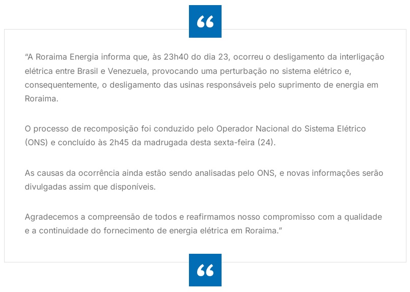 Ainda de acordo com a Roraima Energia, o processo de recomposição do sistema foi coordenado pelo Operador Nacional do Sistema Elétrico (ONS) e concluído às 2h45. As causas da ocorrência ainda estão sob análise, e um parecer técnico deve ser divulgado nos próximos dias.