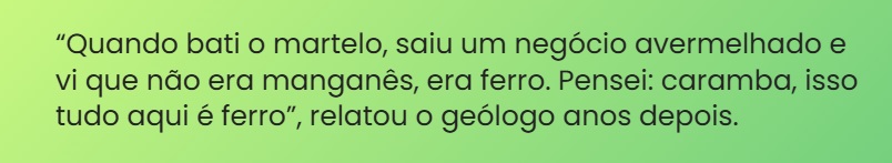 A origem da Mina de Carajás remonta a 1967, quando um pouso de emergência em uma clareira na mata levou o geólogo recém-formado Breno dos Santos a identificar um terreno inóspito e de vegetação rala. A suspeita de uma ‘canga’, formação típica onde há grandes concentrações de ferro próximo à superfície, foi confirmada por amostras coletadas no local.