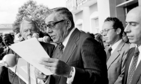 4 de janeiro de 1982: o governador Jorge Teixeira discursa em frente ao Palácio Presidente Vargas. Um momento histórico. Do lado direito, está o ministro do Interior, Mário Andreazza, representando o Governo Federal. Andreazza foi, posteriormente, homenageado com o nome de um município em Rondônia. Foto: R. Machado