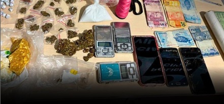 Durante a abordagem, os agentes apreenderam porções de cocaína, maconha e crack, além de três balanças de precisão e diversos materiais utilizados para o fracionamento e embalagem de drogas.