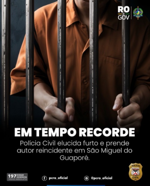 São Miguel do Guaporé (RO) — A Polícia Civil de Rondônia, por meio da 1ª Delegacia de São Miguel do Guaporé, solucionou em menos de duas horas um crime de furto ocorrido nesta semana em um apartamento do município. A ação rápida resultou na prisão em flagrante do autor e na recuperação integral do valor subtraído.