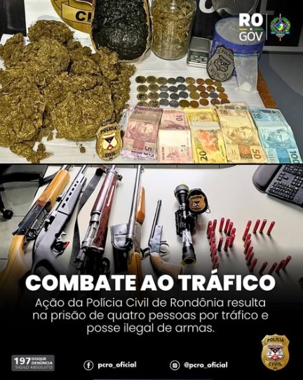 Redação, 02 de julho de 2025 - Uma operação deflagrada na manhã desta quarta-feira (2) pela Polícia Civil de Rondônia, por meio da Delegacia de São Miguel do Guaporé, resultou na prisão em flagrante de quatro pessoas por tráfico de drogas e posse ilegal de armas de fogo. A ação teve apoio das delegacias de Seringueiras, Urupá, Alvorada do Oeste, Costa Marques e também da Polícia Militar.