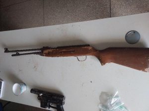 Durante as buscas os policiais localizaram na parte superior do imóvel, um sobrado, duas armas longas sem numeração, sendo uma de calibre .22 e outra de calibre .28. Ao lado da cama do morador foi encontrada ainda uma arma similar a uma metralhadora de fabricação artesanal, calibre 9 milímetros, municiada e pronta para uso.