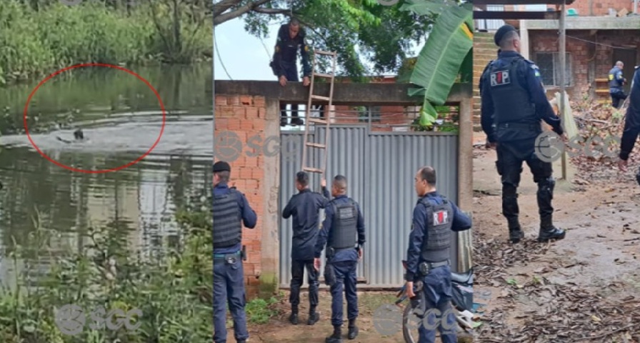 Outras guarnições foram acionadas e um cerco policial foi montado na área, mas, durante a fuga, o suspeito acabou caindo em um esgoto aberto da região. Apesar do incidente, ele conseguiu sair e continuou a fuga, entrando em diversas casas enquanto moradores observavam assustados.