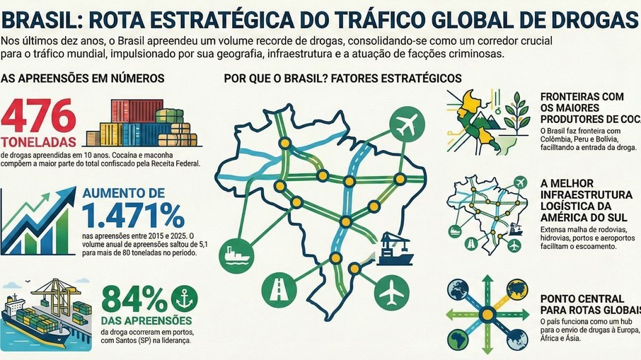 No contexto nacional, o Brasil continua como um dos principais pontos de trânsito de cocaína e outras substâncias ilícitas da América do Sul para mercados na Europa, na África e em outros continentes, apesar de apreensões recordes feitas em portos e aeroportos. Só em 2024 foram interceptados cerca de 69,6 mil quilos de drogas, valor superior ao de 2023 e bem acima dos números de dez anos atrás, refletindo tanto o aumento dos fluxos quanto a intensificação das ações de fiscalização.
