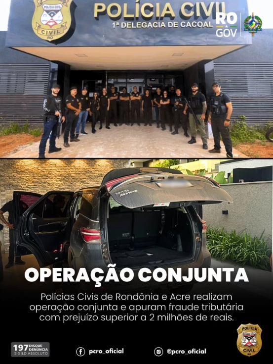 A Polícia Civil de Rondônia participou, nesta quinta-feira (5), de uma operação conjunta com a Polícia Civil do Acre no município de Cacoal, no âmbito de investigação que apura um esquema de fraude tributária responsável por prejuízo superior a R$ 2 milhões aos cofres públicos.