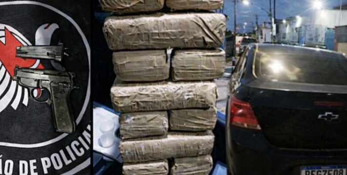 No interior do carro, os militares apreenderam 11 tabletes de substância aparentando ser maconha, dois celulares danificados e uma pistola Taurus calibre .380 com 16 munições, sendo uma delas picotada.